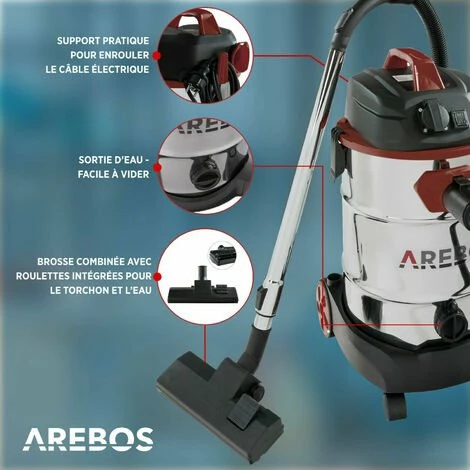En mode aspirateur humide, un filtre en mousse supplémentaire protège le moteur de la saleté. L’aspirateur à sec et humide AREBOS comprend une large gamme d’accessoires, tels qu’un filtre en mousse pour l’aspiration humide, un filtre à plis et trois sacs à poussière pour passer l’aspirateur, une buse combinée pour les tapis et les surfaces lisses et une buse pour espaces étroits difficiles d’accès.
