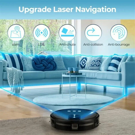 - Navigation Laser; Connecté Wifi 2.4Ghz; Détection du tapis; Nettoyage automatique;Compatible avec Alexa et Google Home; Anti-collision; Hauteur maximale de barrière:18 mm