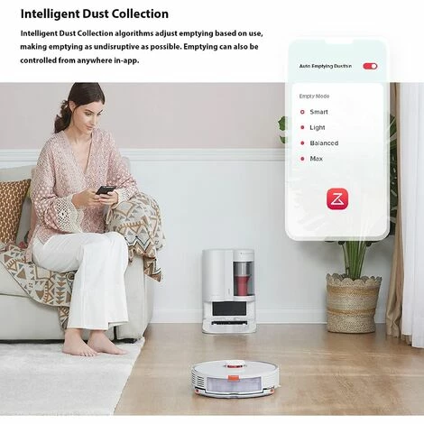 Les algorithmes de collecte intelligente de la poussière ajustent le vidage afin de le rendre moins dérangeant. Le vidage peut aussi être contrôlé depuis n’importe où via l’application.