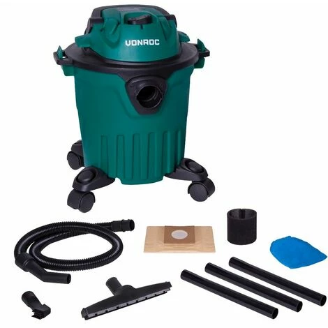 Cet aspirateur multi-usage 1000W de VONROC convient aux petits travaux de nettoyage dans le hangar ou dans le garage. L’aspirateur à eau et poussière a un réservoir de 12 litres et convient pour aspirer la poussière et l’eau. Aussi, ce modèle dispose également d’une fonction de soufflage avec laquelle vous pouvez également souffler des objets très facilement.